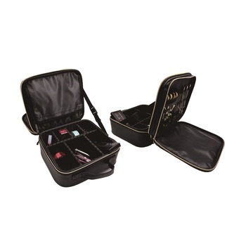 Bolsa organizadora de viaje con cremallera de poliéster/PU de doble capa al por mayor, resistente al agua, almacenamiento de joyas y maquillaje, Impresión de logotipo personalizado